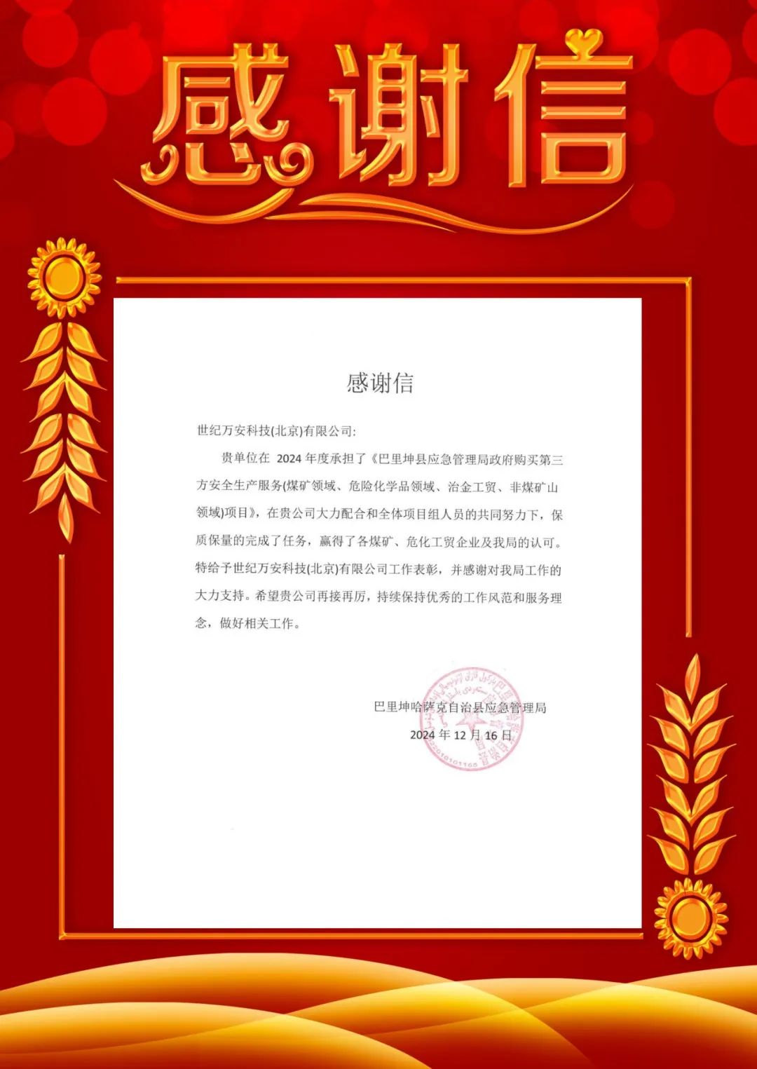 世紀萬安公司助力巴里坤縣安全生產(chǎn)提升 應急管理局致函感謝